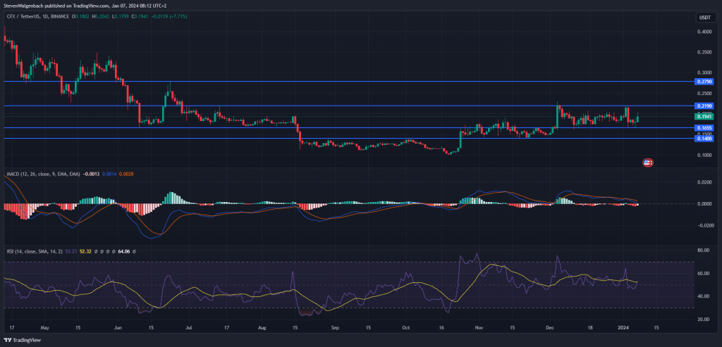 The Conflux price has been in a consolidation channel between $0.1655 and $0.2190 over the past few weeks. Following its 24-hour gain, the altcoin seems to be on track to retest the upper boundary of this range in the coming couple of days.