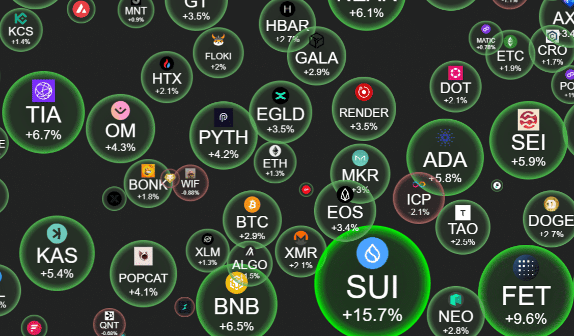 Price Movements: FET has demonstrated a strong bullish trend, with closing prices rising from $1.324 to $1.4. The upward momentum is supported by the exponential moving averages (EMAs), with the 9 EMA consistently above the 20 EMA. This alignment indicates sustained bullish sentiment in the market.