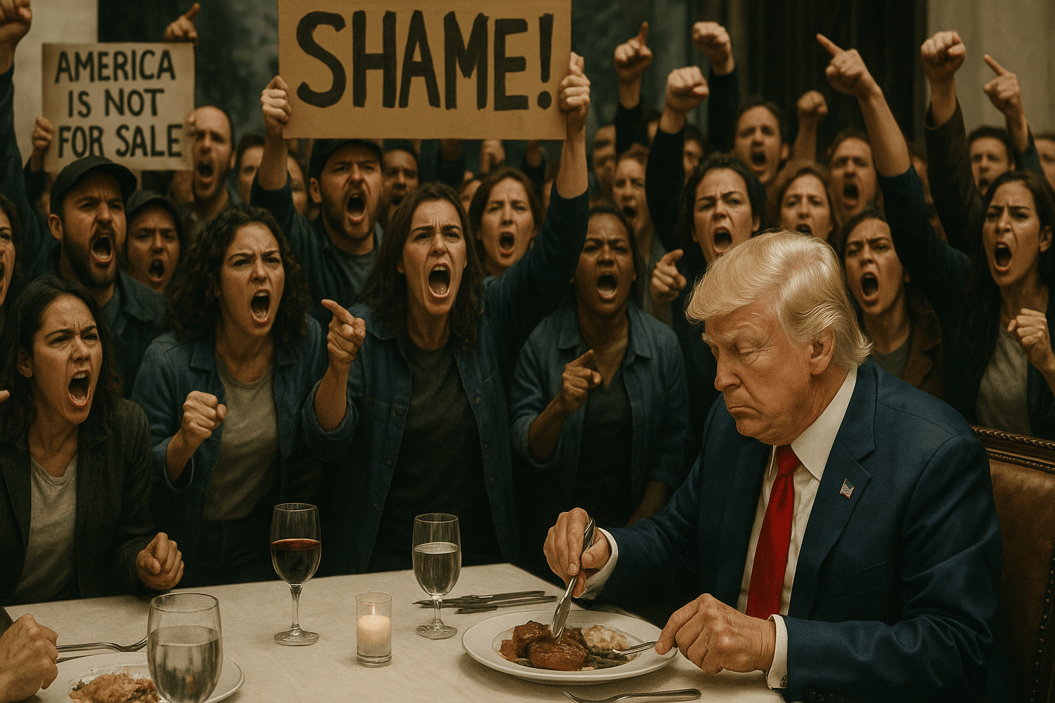 The protesters shouted “Shame!” and “I hope you choke on your dinner!” while carrying placards reading “America is not for sale,” “Memecoin grifters go to jail,” and “Stop Crypto Corruption.”